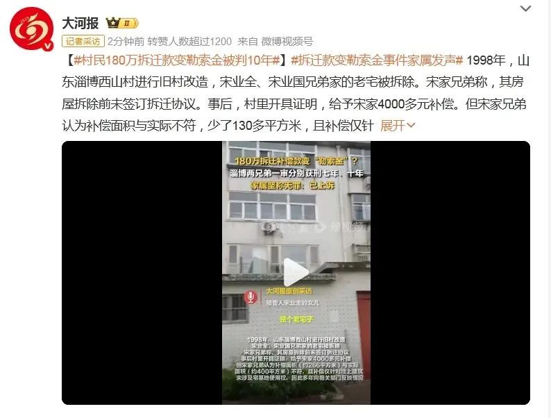 令宋家兄弟俩万万没想到的是,2023年,时任村书记报案称被敲诈勒索,180万补偿款是“被威胁支付”,之后宋家兄弟被带走调查。2025年6月,山东省淄博市淄川区人民法院作出一审判决,认定宋家兄弟犯敲诈勒索罪,分别判处有期徒刑七年、十年。