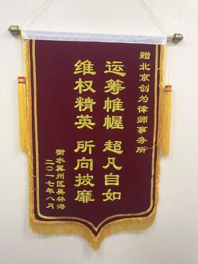 “运筹帷幄 超凡自如,维权精英 所向披靡”慷慨激昂的陈词寄托了吴先生对创为律师事务所稳稳的肯定和深深的共鸣感,这份信任的支持更是对创为律师较好的鼓励。