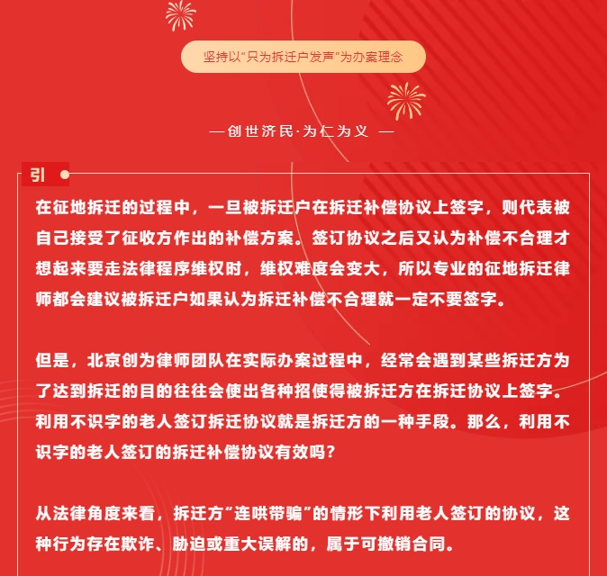 如果您遇到类似的拆迁问题,不妨给我们留言,不用担心,我们来为您提供免费的拆迁在线咨询,全国各地均可无需费力远赴他乡,北京创为律师事务所您坚强的法律后盾。