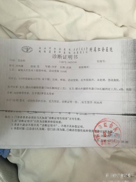 据新闻报道,西安西咸新区曹家庄村76岁的老支书刘某在3月10日下午老人和另一名村民得到通知,于是纷纷到街道办商谈征地补偿相关事宜,但月有阴晴圆缺,商谈过后的返程途中,老人大约骑出两公里后,突然半道上冲出来一辆白色汽车,当时老人并没有在意,但从汽车里出现两名男子反手将刘某推翻,之后两人便对刘某展开了疯狂的毒打,事后两人驾车逃跑,刘某被送到医院进行救治,医疗机构出具诊断书显示刘某双腿骨折,目前警方已经展开调查,万元悬赏征集破案线索。