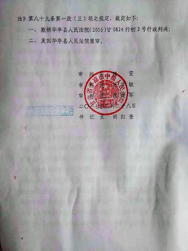 二、发回华亭县人民法院重审。