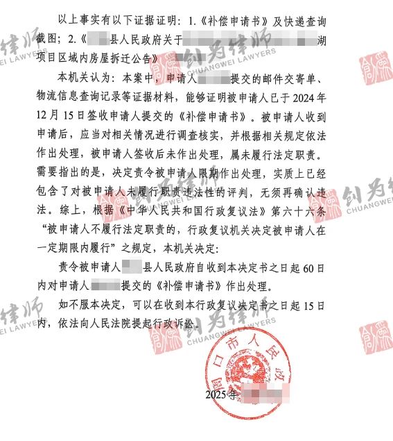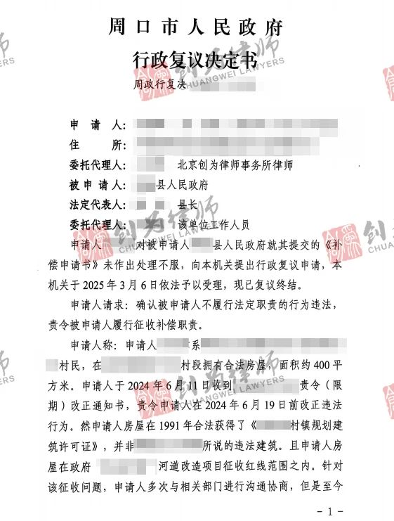 随后北京创为征拆律师团队助两位当事人向上级复议机关提起行政复议。请求确认征收方不履行法定职责的行为违法,并责令征收方履行