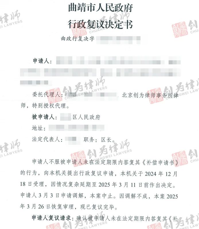 2024年12月,北京创为律师团队助彭先生提起行政复议,要求确认征收方未在法定期限内答复其《补偿申请书》的行为违法;责令征收方作出答复;责令征收方对申请人履行安置补偿职责。
