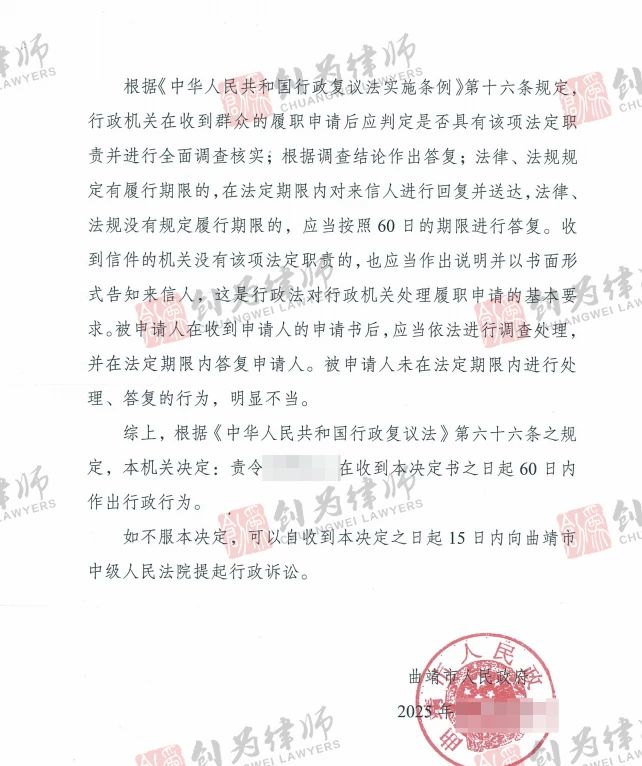综上,根据《行政复议法》第六十六条之规定,本机关决定:责令被申请人在收到本决定书之日起60日内 作出行政行为。