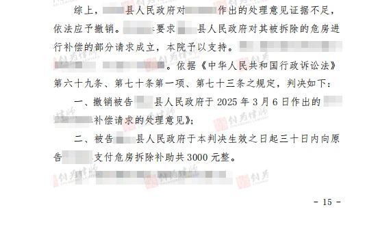 二、被告于本判决生效之日起三十日内向原告陈先生支付危房拆除补助共3000元整。